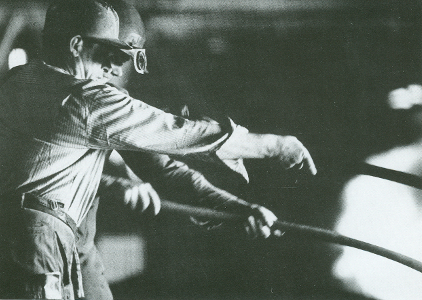 Vierzehn Jahre später präsentierte der "fotoclub ferrum" in der Freilichtausstellung "Lebensjahrzehnte" zu den 21. Arbeiterfestspielen 1986 ein Foto, dessen Motiv dem besprochenen Bild Zu zweit sehr ähnelt, aber in der Bildsprache große Unterschiede aufweist. Die Ausstellung bestand aus acht Bildtafeln, die Personen verschiedenen Alters gewidmet waren. [10] Die Fotoschau gewann ebenfalls eine Goldmedaille. Das angesprochene Foto befand sich auf einer Tafel mit fünf Bildern, die den Stahlwerker Willi Schuster vorstellten. Der Bildaufbau ähnelt dem des Fotos mit dem Titel Zu zweit stark, jedoch arbeitet Schuster allein am Schmelzofen. Der Bildausschnitt ist größer gewählt, wodurch man den Schmelzer in Gänze sieht, sowie den Ofen am rechten Bildrand. Der Stahlwerker erscheint vor dem Hintergrund der Ofenanlage klein. Der Blick des Betrachters wird durch den scharf gezeichneten Hintergrund von dem Arbeiter abgelenkt. Schuster wirkt weniger kraftvoll und zupackend als die Schmelzer in dem Bild Zu zweit. Er steht etwas gebeugt da und stützt eine Hand auf dem Oberschenkel ab. Es erweckt den Anschein, als weiche er vor dem Ofen zurück. Der Ofen wirkt übermächtig und die Arbeit erscheint mühsam. Insgesamt handelt es sich somit um eine personalisierte Aufnahme des Schmelzers Willi Schuster, die durch die Bildkomposition und die Körperhaltung Schusters weniger idealisiert ist.