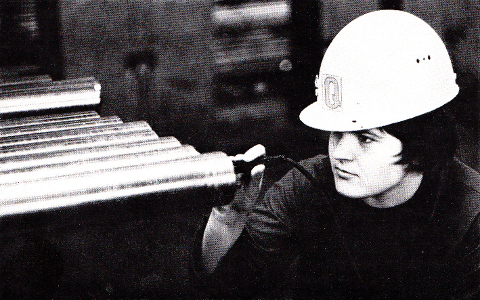 Eines der Bilder der Kollektion zeigt eine Frau bei der Prüfung von Rohren auf Innenfehler. Das Bild gehört zu den drei im Katalog nicht abgedruckten Fotos. Es findet sich in der Jubiläumsschrift zum fünfundzwanzigjährigen Bestehen der Fotogruppe des VEB Stahl- und Walzwerk Riesa. [31] Auf der linken Seite des Schwarz-Weiß-Bildes im Querformat sieht man die Enden von Stahlrohren, die nebeneinander aufgereiht liegen. In der rechten Bildhälfte kontrolliert eine Frau das vorderste Rohr von Innen mit einem Prüfgerät, das an einem Kabel hängt. Der Bildausschnitt ist eng gewählt, so dass der Kopf der Frau einen großen Bereich des Bildes einnimmt und von ihrem Oberkörper nur etwa die Hälfte zu sehen ist. Durch die geringe Tiefenschärfe verschwimmt der Hintergrund. Der Kopf der Frau, die einen weißen Helm trägt, zieht die Blicke auf sich. Dieser Effekt wird durch die Linienführung der Rohre, die auf den Kopf der Frau zulaufen, verstärkt. Die Szene wirkt sauber und ordentlich. Die Rohre sind aufgereiht und glänzen, der weiße Helm und die Arbeitskleidung der Frau sind sauber. Die Frau schaut konzentriert in das Innere des Rohres. Das Bild vermittelt Ordnung und nicht zuletzt die Einhaltung und Kontrolle der Qualitätsstandards.