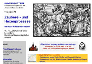 Seit 1987 hat sich der Sonderforschungsbereich 235 der Deutschen Forschungsgemeinschaft an der Universität Trier besonderes Ansehen erworben. Der Titel lautet: "Zwischen Maas und Rhein: Beziehungen, Begegnungen und Konflikte in einem europäischen Kernraum von der Spätantike bis zum 19. Jahrhundert". Für die vierte und fünfte Forschungsphase vom 1. Januar 1997 bis zum 31. Dezember 2002 wurde ein neues Teilprojekt A 5 "Zauberei- und Hexenprozesse im Maas-Rhein-Moselraum, 15.-17. Jahrhundert, unter besonderer Berücksichtigung räumlicher Aspekte" unter der Leitung von Franz Irsigler und Gunther Franz bewilligt. Einerseits waren die bisherigen Arbeiten der Arbeitsgemeinschaft beste Voraussetzungen für das Projekt, andererseits kann das Editionsvorhaben durch die personelle und institutionelle Förderung der Deutschen Forschungsgemeinschaft fortgesetzt werden. Dabei sind aber die unterschiedlichen Ziele zu beachten. Das SFB-Projekt hat die regionale Bestandsaufnahme in dem größeren Raum zwischen Maas und Rhein zum Ziel.