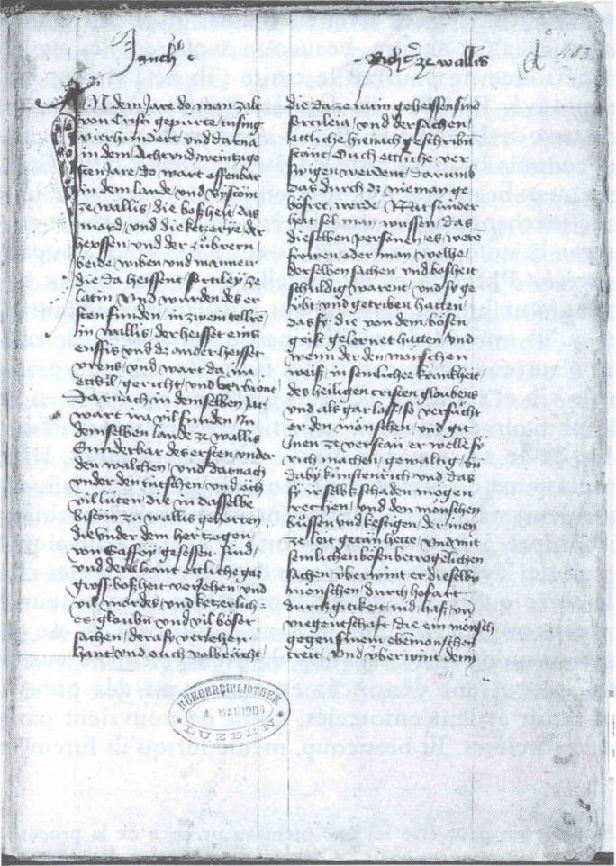 Bericht des Hans Fründ über Hexenverfolgungen im Wallis, erste Seite, Zentralbibliothek Luzern.