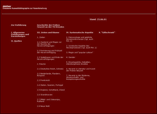 <1> An Bibliografien zur Hexenforschung im Internet herrscht kein Mangel. Häufig beschränken sie sich jedoch auf einige wenige grundlegende Literaturhinweise. Umfangreichere Literaturlisten dagegen sind meistens sehr unübersichtlich: Veraltete und wissenschaftlich unhaltbare Titel stehen neben Neuerscheinungen; geordnet sind sie in der Regel nur alphabetisch, höchstens noch nach Verfolgungsregionen. Es fehlte bisher an einer kritischen Auswahlbibliografie, die die Reichhaltigkeit der neueren Forschung wiederspiegelt und den Einstieg in die verschiedensten Aspekte des Themas erlaubt. Seit November 2000 versucht die Dresdner Auswahlbibliografie zur Hexenforschung (DABHex), diese Lücke zu füllen. Als zweckmäßiges Instrument zur Forschung muss sie erstens eine Selektion aus der Vielzahl neuerer Titel vornehmen, zweitens eine sinnvolle Gliederung zu Grunde legen und drittens regelmäßig aktualisiert, verbessert und erweitert werden.