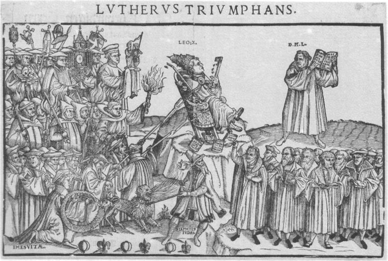 Flugblatt Lutherus Triumphans: Staphylus, als Judas apostrophiert, führt eine Chimäre, Allegorie der Trimembris Epitome, ins Feld gegen die lutherischen Theologen. Quelle: Harry Oelke: Die Konfessionsbildung des 16. Jahrhunderts im Spiegel illustrierter Flugblätter. Berlin / New York 1992 (= Arbeiten zur Kirchengeschichte, 57), Abb. 32. |