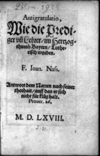 | 17 | Johannes Nas: Antigratulatio, Wie die Prediger vnd Lehrer / im Hertzogthumb Bayern / Lutherisch worden, Ingolstadt 1568. |