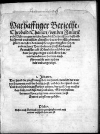 | 53 | Theobald Thamer: Warhafftiger Beriecht / Theobaldi Thameri / von den Iniurien vnd Lästerungen / welche ihme die Lutherischen deßhalb falsch vnd vnchristlich zumessen / das er den Glauben mit guten wercken des menschens gerechtigkeit setzet / vnd in sanct Bartholomes steifftkirchen zu Franckfurt amb Mäen disen allso bis ins dritt jar geprediget vnd bekent hat / wie denn davon hierinn auch fürnemlich wirt gehandelt vnd angezeigt, o.O. 1552; das zugrunde gelegte Berliner Exemplar Dg 5414 ist beschädigt. |