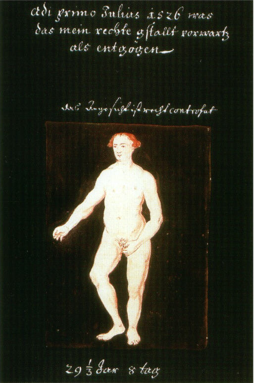 Matthäus Schwarz (1497-1574), Selbstbildnis nackt von vorn (1526) Text: "Adi primo Julius 1526 was das mein rechte gstallt vorwartz als entgögen. Das Angesicht ist recht controfat. 29 1/3 Jar 8 tag"Quelle: Richard van Dülmen (Hg.): Entdeckung des Ich. Die Geschichte der Individualisierung vom Mittelalter bis zur Gegenwart, Köln / Weimar / Wien 2001, 190a. |