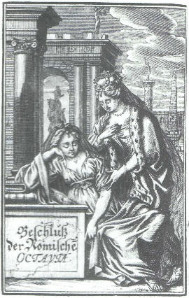 Titelkupfer eines unbekannten Künstlers für den fünften Band der ersten Fassung der "Römischen Octavia" von 1706. Quelle: [Anton Ulrich von Braunschweig-Wolfenbüttel:] Beschluß Der Römischen Octavia/ Der Durchleuchtigsten Herzogin gewidmet/ Die diese Römerin von ihrem mehr als zwanzigjährigem Schlaff aufferwecket. Nürnberg/ In Verlegung Joh. Hoffmanns S. Wittib/ und Engelbert Streck. Anno MDCCIV [erschienen erst 1706] Christian-Erlang/ Druckts Johann Friderich Regelein. - Herzog August Bibliothek Wolfenbüttel, Signatur: Lo 75.6: 5. Die "Römische Octavia" ist der zweite Roman des Welfenherzogs Anton Ulrich von Braunschweig-Wolfenbüttel (1633-1714) und entstand mit langen Unterbrechungen zwischen 1674 und 1714 in einer sechsbändigen ersten Fassung und einer unvollendeten siebenbändigen zweiten Fassung. Im Mittelpunkt der Handlung steht die Titelfigur Octavia, die erste Gattin Kaiser Neros. In der Romanfiktion ist sie zum Christentum konvertiert, hat auch seinen Mordanschlag aus dem Jahre 62 überlebt und kämpft nun um ihre Liebe zum armenischen König Tyridates. Um diese Zentralhandlung rankt sich eine Vielzahl von Nebenhandlungen und Seitengeschichten. |