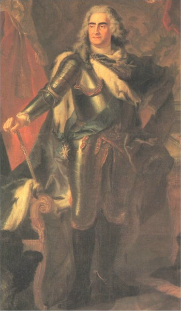 Gemälde Augusts des Starken von Louis de Silvestre (1718); Staatliche Kunstsammlungen Dresden, Gemäldegalerie Alte Meister Quelle: Ulli Arnold / Werner Schmidt (Hg.): Barock in Dresden, Katalog zur Ausstellung in der Villa Hügel zu Essen vom 8. Juni bis 2. November 1986, Leipzig 1986, 73. Friedrich August I., Kurfürst von Sachsen und als August II. König von Polen (1670-1733), war für seine Mätressenwirtschaft und für seine opulenten Hoffeste berühmt. 1694 begann seine Liaison mit Aurora von Königsmarck, die bis 1696 andauerte. Der Sohn, der aus dieser Beziehung hervorging, wurde als Moritz von Sachsen Marschall von Frankreich. |