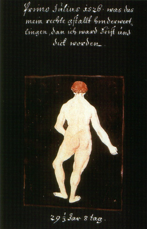 Matthäus Schwarz (1497-1574), Selbstbildnis nackt von hinten (1526) Text: "Primo Julius 1526 was das mein rechte gstallt hinderwertlingen, dan ich ward feist und dick worden. 29 1/3 jar 8 tag." Quelle: Richard van Dülmen (Hg.): Entdeckung des Ich. Die Geschichte der Individualisierung vom Mittelalter bis zur Gegenwart, Köln / Weimar / Wien 2001, 190a. |