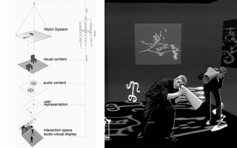 Mixed Reality-Bühne: Überlagerung von digitalen Levelswie Nutzter-Erfassung, Bild, Klang und Repräsentanz mit dem physikalischen Raum