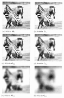 Je unschärfer das Bild wird, desto mehr verschwinden die feineren Linien im Fell der Zebras, während die niederfrequenten Anteile übrig bleiben.
