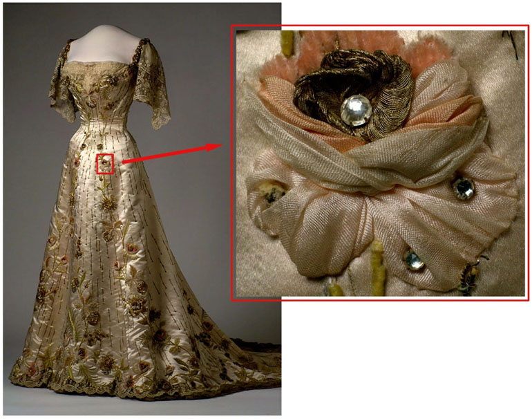 Visualisation of details - individual threads in the design of a rosette on Norway’s Queen Maud’s dress.