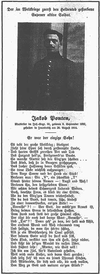 | Mit der Todesanzeige für den „ im Weltkriege zuerst den Heldentod gestorberne(n) Eupener aktive(n) Soldat“ Jacob Pontenin in den Eupener Nachrichten vom 15. Februar 1915 beginnt die öffentliche Kommemoration der Opfer des großen Krieges in Eupen-Malmedy. |