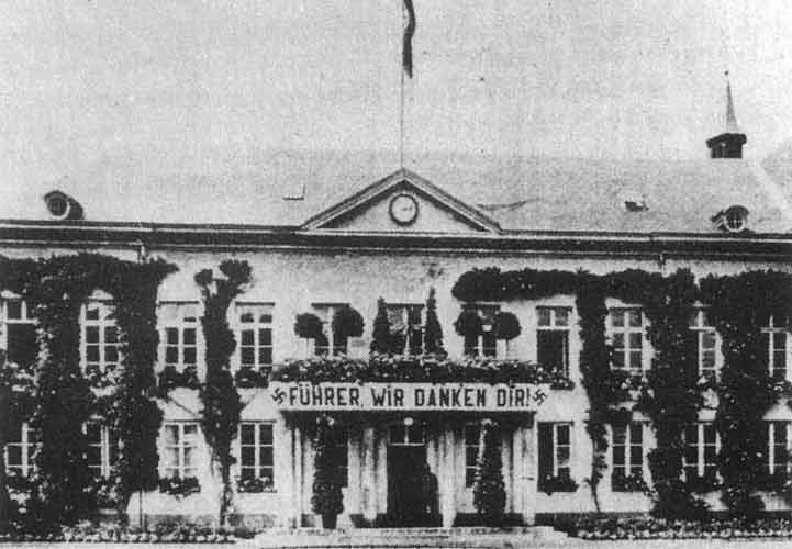 | Führer, wir danken dir! Der Einmarsch der deutschen Truppen in Belgien am 10. Mai 1940 wurde von einer Mehrheit der Bevölkerung als lang ersehnte „Heimkehr ins Reich“ gefeiert. Das Eupener Rathaus hieß den „Führer“ mit einem Transparent willkommen, in: Lejeune /Fickers /Cremer: Spuren in die Zukunft. Anmerkungen zu einem bewegten Jahrhundert, Büllingen 2001, 102. |
