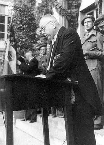 | Befreiungsansprache Hugo Zimmermann Mit der als „Befreiungsansprache“ angekündigten Rede vom 7. April 1945, bei der auch der belgische Minister für zivile Kriegsopfer Pauwels anwesend war, beginnt die Phase der „forcierten Assimilierung“ der Eupen-Malmedyer. In patriotischem Pathos forderte Eupener Bürgermeister Hugo Zimmermann seine Bürger auf, „nunmehr offen und ehrlich belgisch zu denken und belgisch zu fühlen“! |