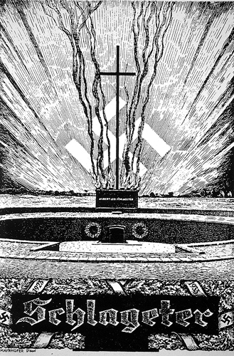 | E. Mayrhofer, Titelblatt eines Schlageterbuches, Düsseldorf 1933 Wiedergabe nach der Reproduktion in: Kathrin Hoffmann-Curtius: Das Kreuz als Nationaldenkmal: Deutschland 1814 und 1931, in: Zeitschrift für Kunstgeschichte, Bd. 48, 1985, 77-100, hier 97 |