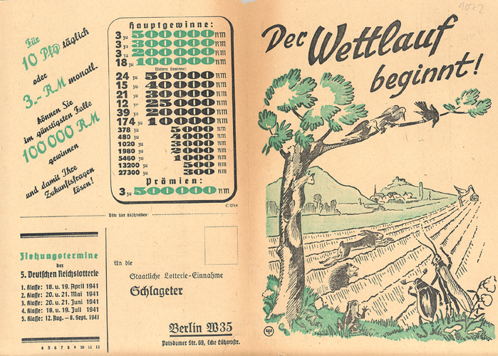 Faltblatt der Staatlichen Lotterie-Einnahme Schlageter, Frühjahr 1941, Deckblatt und Rücken