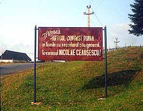 Lebensalltag I: Verrostetes Schild vor einem Dorf: "Es lebe die Kommunistische Partei Rumäniens an vorderster Front mit Generalsekretär Nicolae Ceausescu!"