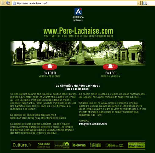 Auf den ersten Blick eine Seite, die nicht in die Sammlung wissenschaftlicher Forschungsprojekte passt. Da Friedhöfe jedoch der Ort persönlicher Erinnerungskultur schlechthin sind, verdient der " Cimetière du père Lachaise " besonderes Augenmerk. Die Seite des bekanntesten und größten Pariser Friedhofes bietet die Möglichkeit eines virtuellen Rundganges und die gezielte Suche nach einzelnen Grabstätten (mit Bildern und sehr detaillierten Informationen über die Toten). Die Navigation erfolgt über eine Karte des Friedhofes. |