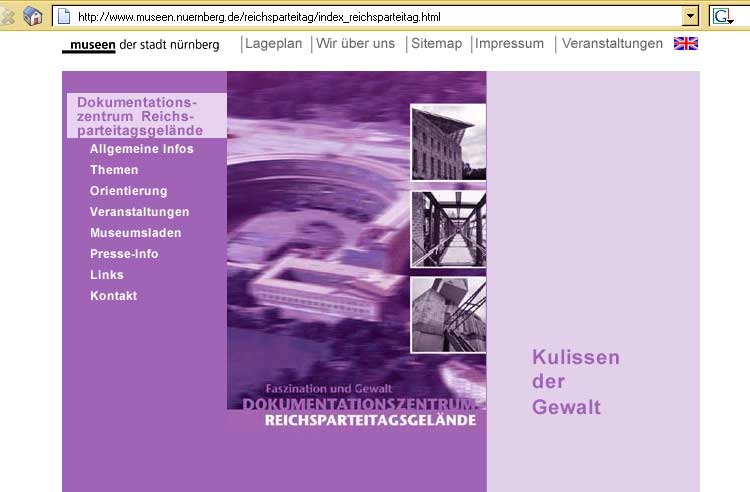 Das ehemalige Reichsparteitagsgelände ist, als Ort der öffentlichen Inszenierung des NS-Regimes, von besonderer Bedeutung für Erinnerung und Erinnerungskultur in Deutschland. Die Stadt Nürnberg hat auf dem Gelände ein Dokumentationszentrum und Studienforum eingerichtet und leistet auf diese Weise einen Beitrag zur intensiven Auseinandersetzung mit dem Thema. Neben allgemeinen Hinweisen zu Öffnungszeiten und Eintrittspreisen erhält der Besucher auch historische Hintergrundinformationen über den Ort. |