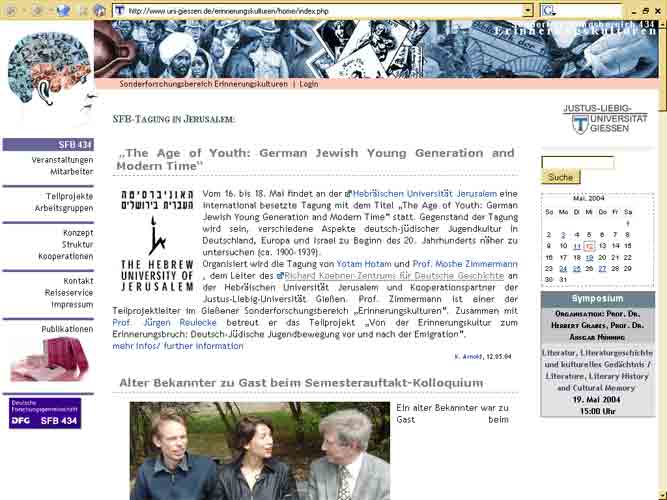 Der Gießener Sonderforschungsbereich (SFB) "Erinnerungskulturen" untersucht die Inhalte und Formen kultureller Erinnerung von der Antike bis ins 20. Jahrhundert. Er vereinigt insgesamt 19 Hochschullehrer und ca. 70 Mitarbeiter aus neun kulturwissenschaftlichen Disziplinen. Neben Historikern und Germanisten forschen unter dem Dach des SFB Latinisten, Gräzisten, Kunsthistoriker, Romanisten, Anglisten, Orientalisten, Philosophen, Politologen und Soziologen. Zwei Teilprojekte sind an der Universität Siegen angesiedelt, zwei an der Hebrew-University in Jerusalem. |