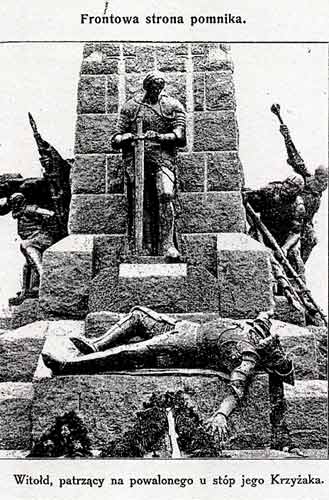 Grunwalddenkmal in Krakau. Aufnahme von 1910. Vorderseite: Witold und Ulrich von Jungingen. Quelle: Wieniec Grunwaldzki z 1910 roku. Kraków 1910