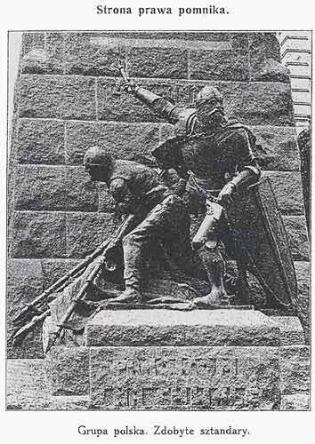 Grunwalddenkmal in Krakau. Aufnahme von 1910. Rechte Seite: polnische Gruppe mit erbeuteten Standarten. Quelle: Wieniec Grunwaldzki z 1910 roku. Kraków 1910