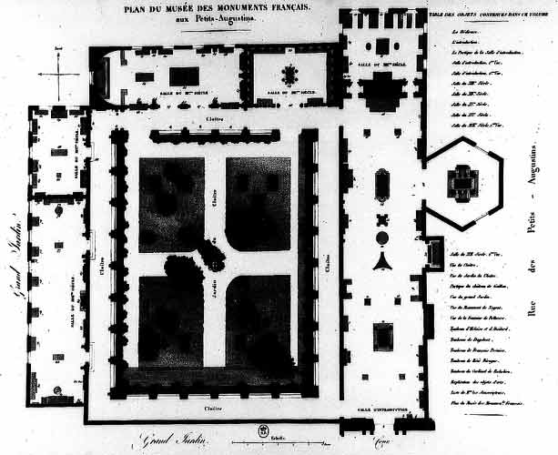 | Réville, Lavallée: Grundriss des Musée des Monuments Français. Vues pittoresques et perspectives des Salles du Musée des Monuments françois, et des principaux ouvrages d’architecture, de sculpture et de peinture sur verre qu’elles referment, gravées au Burin, en vingt estampes, par MM. Réville et Lavallée, d’après les dessins de M. Vauzelle: avec un texte explicatif par B. de Roquefort. Ouvrage dédié et présenté au Roi, Paris (P. Didot, l’ainé) 1816 |