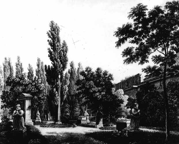 | Der Garten, zeitgenössischer Stich von Portier nach Vauzelle. Vues pittoresques et perspectives des Salles du Musée des Monuments françois, et des principaux ouvrages d’architecture, de sculpture et de peinture sur verre qu’elles referment, gravées au Burin, en vingt estampes, par MM. Réville et Lavallée, d’après les dessins de M. Vauzelle: avec un texte explicatif par B. de Roquefort. Ouvrage dédié et présenté au Roi, Paris (P. Didot, l’ainé) 1816 |