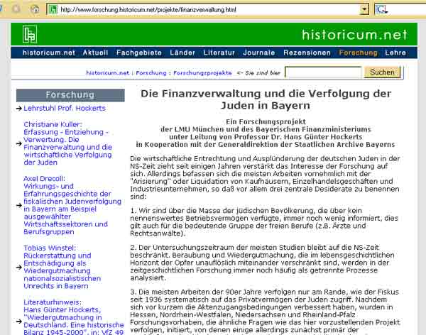 Die Seite stellt das Forschungsprojekt „Die Finanzverwaltung und die Verfolgung der Juden in Bayern“ mit seinen drei Teilstudien vor. Im Rahmen des Projektes entstehen zwei Studien zur NS-Verfolgung und eine Studie zur Wiedergutmachung nach 1945. Das Projekt wird im November 2004 abgeschlossen. Eine Kurzfassung der Ergebnisse soll zu diesem Zeitpunkt in einer Broschüre publiziert werden. |
