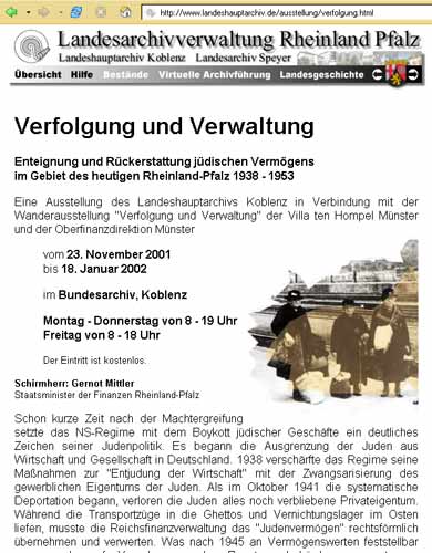 Die Seite verweist nur knapp auf die Ausstellung "Verfolgung und Verwaltung", die das Landeshauptarchiv Koblenz in Verbindung mit der Wanderausstellung "Verfolgung und Verwaltung" der Villa ten Hompel Münster und der Oberfinanzdirektion Münster veranstaltete. Zur Ausstellung ist ein Begleitband mit ausführlicher Darstellung und Dokumentation erschienen: „Dem Reich verfallen“ – „den Berechtigten zurückzuerstatten“. Enteignung und Rückerstattung jüdischen Vermögens im Gebiet des heutigen Rheinland-Pfalz 1938-1953, bearb. von Walter Rummel und Jochen Rath, Koblenz 2001. |