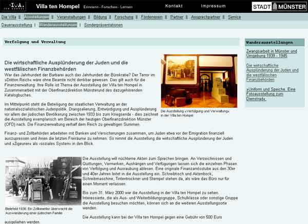 Die Ausstellung der Villa ten Hompel war eine der ersten, die sich mit der Rolle der westfälischen Finanzverwaltung und ihrer Beamten bei der wirtschaftlichen Ausplünderung der Juden während des „Dritten Reiches“ auseinandersetzte. Die Ausstellung konzentriert sich auf den Bereich der Oberfinanzdirektion Münster und ist noch immer als Wander- und Mantelausstellung an wechselnden Orten in Deutschland zu sehen. Zur Ausstellung ist ein Sammelband erschienen: Alfons Kenkmann/Bernd-A. Rusinek (Hg.), Verfolgung und Verwaltung. Die wirtschaftliche Ausplünderung der Juden und die westfälischen Finanzbehörden, Münster 1999. |