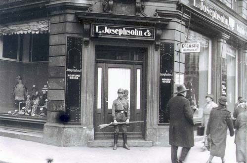 Ein SA-Mann hindert während des reichsweiten Boykotts am 1. April 1933 die Kundschaft am Betreten des Textilgeschäfts L. Josephson & Co. in der Prielmayerstr. 20. (Quelle: Stadtarchiv München)