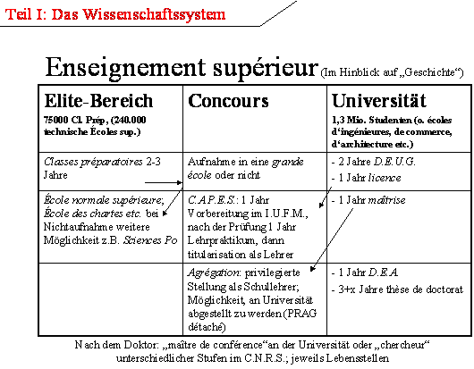 Das Ausbildungs- und Wissenschaftssystem geht in seinem strukturellen Kern auf die napoleonischen Reformen 1808/09 in der Umsetzung der Revolutionsgrundsätze zurück. Die 1968er-Reform ('loi Fauré') und auch der erneute Reformeinschnitt 1984 ('loi Savary') betrafen die Universitäten, zum Beispiel aber nicht das para-universitäre System der grandes écoles. Das staatliche System ist heute unter der Ägide des ministère de l' Éducation nationale in drei Ministerialzuständigkeiten aufgeteilt - éducation nationale für die Schulbildung, enseignement supérieur für die Hochschullehre und recherche für die Wissenschaft. In der Realität der institutionellen Verknüpfungen sind der sekundäre und der tertiäre Ausbildungsbereich eng verbunden, die Forschung hingegen ist zum Missfallen vieler oft relativ wenig mit den Universitäten verknüpft. Anders als in Deutschland, wo das Humboldt'sche Universitätskonzept zwar die Integration von Forschung und Lehre vorsieht, 'Forschung' aber in der ungeschriebenen Wertematrix, wie bei Berufungen, Drittmittelprogrammen und Evaluationen immer wieder manifest wird, doch an erster Stelle steht, ist das tendenzbestimmende Leitbild für die Universitäten in Frankreich eher das des 'enseignement', weniger das der 'recherche'. Geschichte an der Universität wird primär als Ausbildungszyklus für Lehrer an collèges, lycées und wieder an der Universität selbst verstanden, weniger als Ausbildung von Wissenschaftlern. Das bedeutet nicht, dass die Lehre in Frankreich im Durchschnitt intensiver und personenbezogener funktionierte als in Deutschland, also nicht wie etwa im angloamerikanischen Tutorialsystem. Frontalunterricht ist in den Schulen und in den Universitäten bis kurz vor dem Abschlussjahr durchaus noch die Regel, wenngleich es natürlich viele positive Ausnahmen gibt (das Student / Dozent-Verhältnis in Frankreich liegt bei 18,1:1, in Deutschland bei 12,3:1 nach der OECD-Studie von 2003). Die Verzahnungen von Universität und Schule sind personell gerade in den frühen Karriereabschnitten von Dozenten sehr viel enger als in Deutschland. [3]
