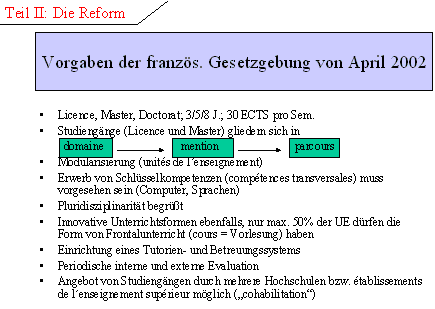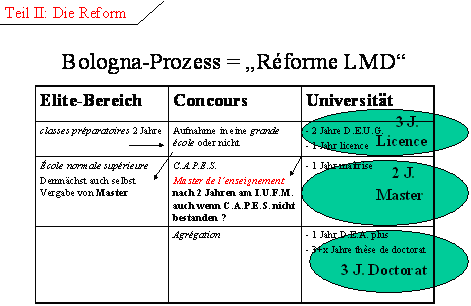 Allerdings ist in der Reformgesetzgebung versteckt die Beibehaltung der alten Abschluss-Stufen als 'diplômes intermédiaires' vorgesehen. In den Umstrukturierungsüberlegungen erscheint so auch weiter die Idee eines Abschlusses schon nach zwei Jahren und insbesondere die Aufsplittung des Masters in eine allgemeine Stufe M1 und eine entweder forschungsorientierte oder berufspraktisch orientierte Stufe M2.