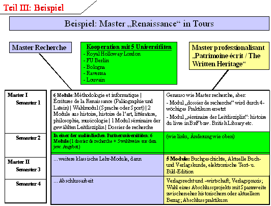 Das Centre wird nur einen Master und dann die Promotion anbieten, wie es auch jetzt schon keine licence angeboten hat. [15] Da die Interdisziplinarität längst vorliegt, ist eine entsprechende Modularisierung leicht möglich. Die Konzentration richtete sich in Tours daher auf die internationale Komponente, um so ein Programm zu entwickeln, für das man dann bei der EU eine Erasmus-MUNDUS-Förderung einwerben kann: Der Master soll multinational in Kooperation mit dem Royal Holloway College in London, mit der Université de Louvain, mit Bologna und Ferrara sowie mit der FU Berlin angeboten werden. Die Institutionen stimmen sich auf einen weitgehend ähnlichen Ablauf in den ersten beiden Semestern ab, im zweiten Semester des ersten Jahres wechselt der Student an eine der Partner-Universitäten. Im zweiten Jahr wählt der Student zwischen einem eher forschungsorientierten Master oder einem 'master professionalisant'. Tours und London bieten hier 'Patrimoine écrit de la Renaissance' bzw. 'Cultural heritage of the Renaissance' an. Der Student absolviert dann schon im ersten Semester des ersten Jahres ein vierwöchiges Kurzpraktikum und belegt ein Seminar in den Buchgeschichtskursen der Nationalbibliotheken in Paris oder London. Im zweiten Jahr bietet Tours dann Einführungen sowohl in die Buchgeschichte als auch in die heutige Editionstechnik, in das Urheber- und Verlagsrecht sowie zum Computereinsatz im Digitalisierungs- und Editionsbereich an.