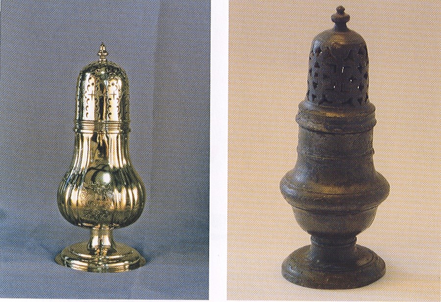 Fenster schließenZuckerstreuer aus Silber mit dem Allianzwappen der adligen Familien von Dorgelo und von Schele aus der Werkstatt des Quakenbrücker Meisters Bockstöver um 1750 und ein ähnlich gearbeitetes, die Formensprache aufgreifendes Stück aus Zinn aus bäuerlichem Besitz – ein Zeichen für den sozialen Kulturtransfer in der Region. Silberner Zuckerstreuer, Stadtmuseum Quakenbrück. Zuckerstreuer aus Zinn, Museumsdorf Cloppenburg. Fotos Museumsdorf Cloppenburg.
