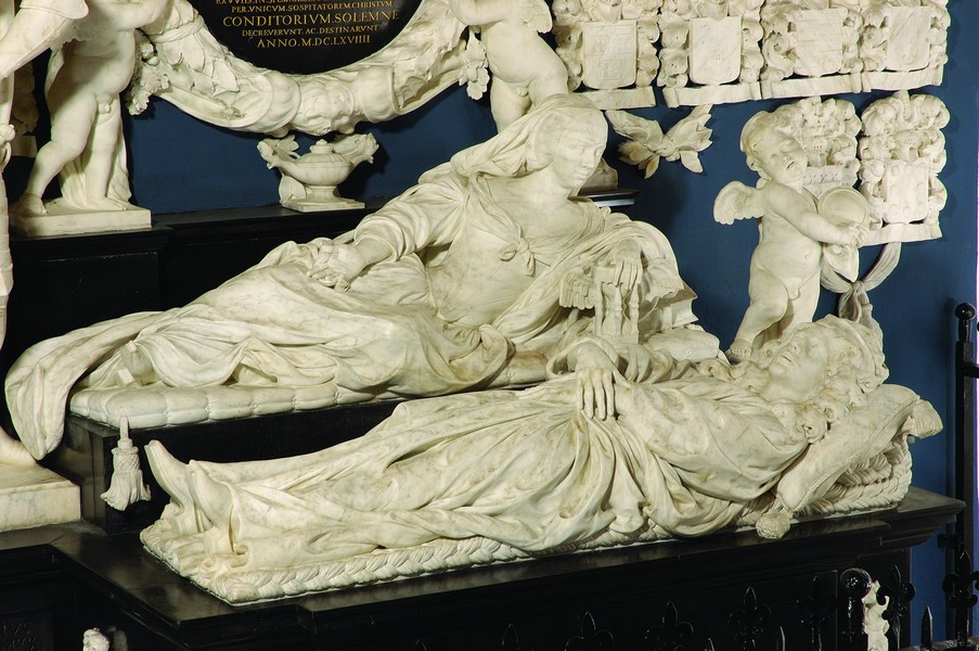 Fenster schließenDas Detail aus dem Grabmal zeigt die adlige Auftraggeberin, Anna von Ewsum, als Trauernde - tief dekolletiert und im Nachgewand - über ihrem verstorbenen Gatten Carl Hieronymus zu Inn- und Knyphausen. Mit diesem Grabmal schuf sie ihr Ebenbild in unvergänglicher Jugend und konnte sich als Stifterin und Mäzenin eines der Hauptwerke der nordniederländischen Barockplastik rühmen. Foto Museumsdorf Cloppenburg.