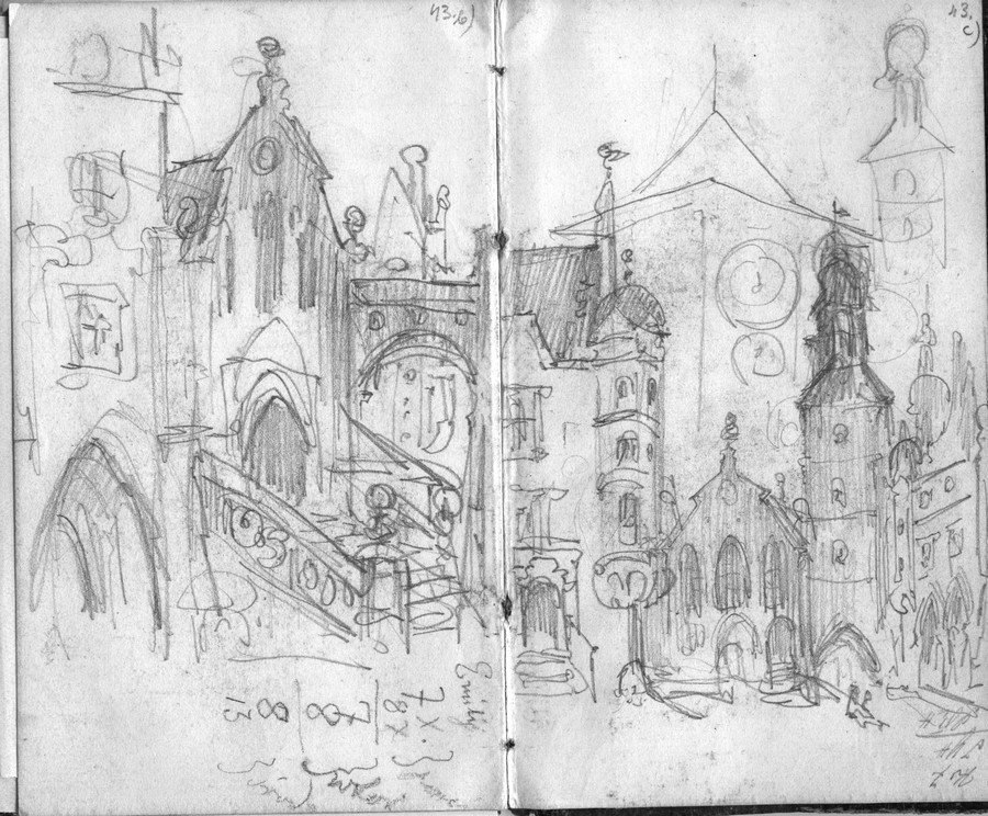Fenster schließenJan Matejko, Marienplatz in München, 1859, Zeichnung, 11 x 7,2 cm, Krakau, Muzeum Narodowe w Krakowie-Dom Jana Matejki, Inv. Nr. IX/2699/43b-c