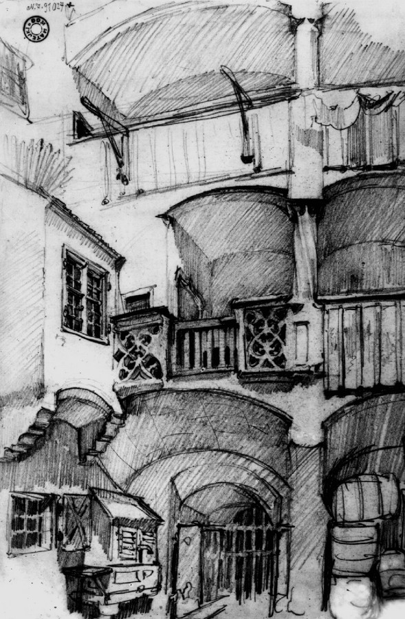 Fenster schließenJan Matejko, Der Hofraum des ehemaligen Schlafhaubenkrämers, 1859, Zeichnung, 29 x 19,7 cm, Krakau, Dom Jana Matejki, Inv. Nr. IX/414