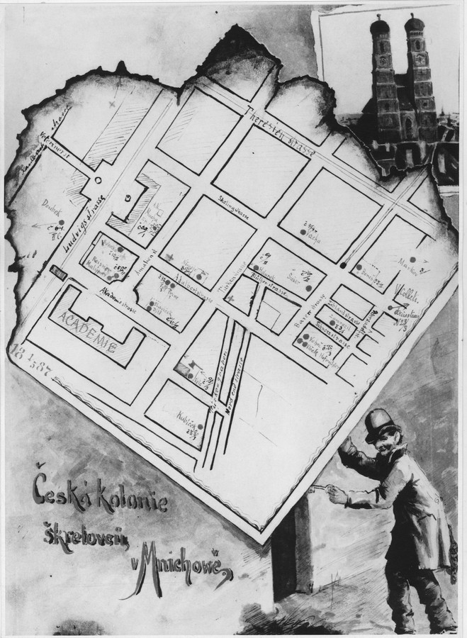 Karel Reisner (?), Plan mit Umgebung der Kunstakademie und den Anschriften der Mitglieder des Škréta-Vereins, 1887, Tuschzeichnung, Aquarell, 34 x 21 cm, Nationalgalerie Prag / Archiv, Inv.-Nr. AA 765, Foto: Nationalgalerie