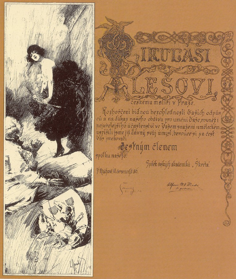 Luděk Marold und Alfons Mucha, Škréta-Diplom für Mikoláš Aleš, 1886, Tuschzeichnung, 49 x 15 cm, Museum der tschechischen Literatur Prag, Foto: Museum der tschechischen Literatur