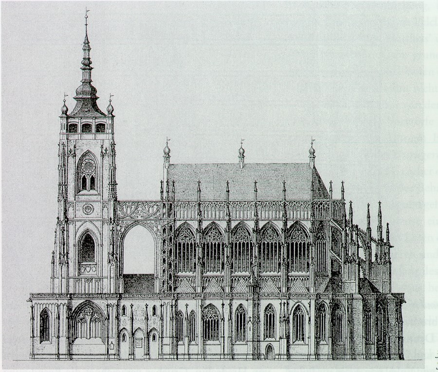 Bernhard Grueber, Südseite der St.-Veits-Kathedrale in Prag, Abbildung aus: Bernhard Grueber: Die Kunst des Mittelalters in Böhmen. Teil 3: Die Periode des luxemburgischen Hauses 1310-1437, Wien 1877, 37, Abb. 42