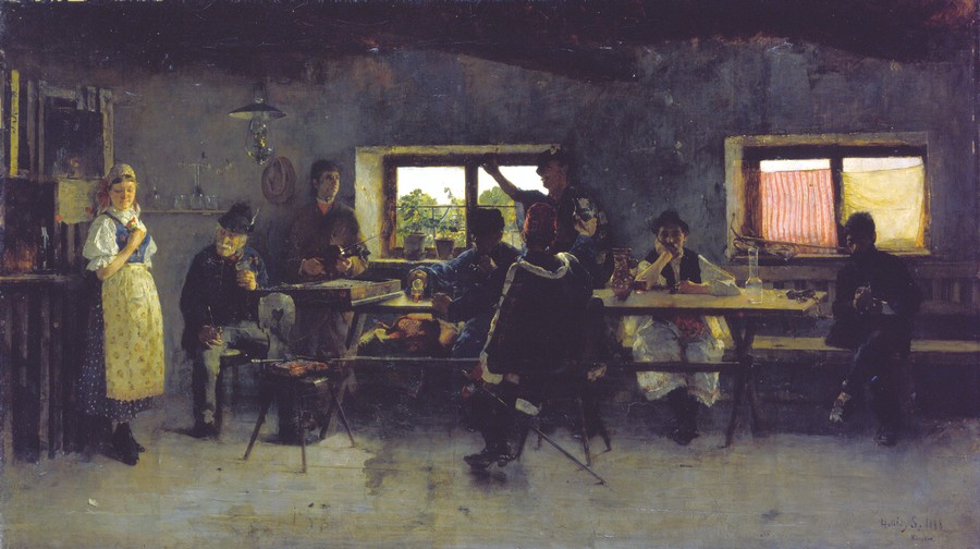 Simon Hollósy, Der Toast in der Csárda (Kocsmában mulatozók), 1888, Öl auf Leinwand, 78,5 x 137 cm, Ungarische Nationalgalerie, Inv. Nr. 5554