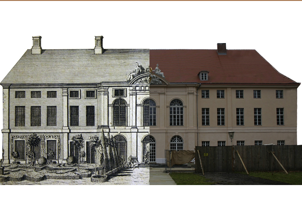 Collage des Titelblatts: Viktor Hanck (SPSG), aus: 1) Nach David Schleuen dem Ä., Ansicht der Gartenfassade von Schloss Schönhausen, 1763, Kupferstich, SPSG, Plansammlung, Kupferstichbände, Mappe 176 A, alte Nr. 2661, und 2) Ansicht der Gartenfassade von Schloss Schönhausen, Zustand 2007, Foto: Detlef Fuchs (SPSG).