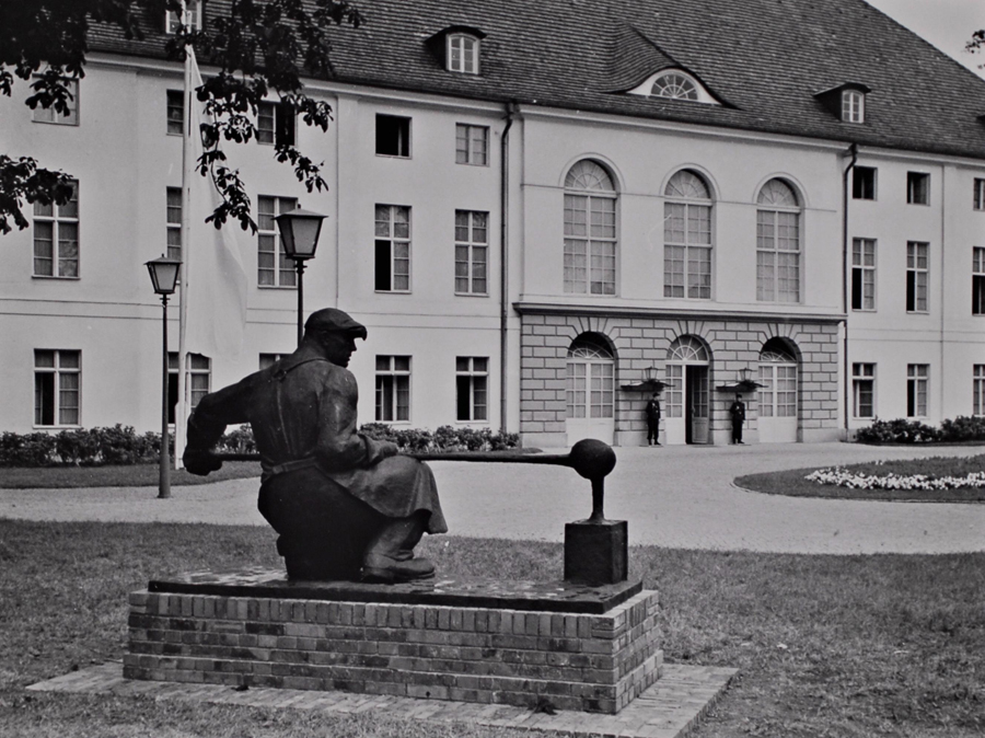 Abb 3: Schloss Schönhausen, Hofseite, Amtssitz des Präsidenten mit Plastik Walter Reinhold/Rolf Lohner: Stahlgießer (1951), um 1955 (Bundesarchiv, Berlin)