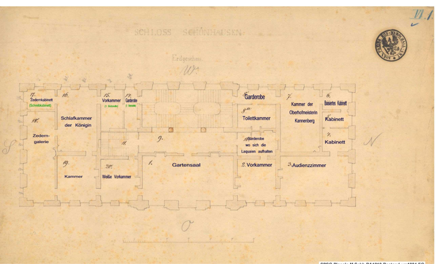 Abb. 1 Grundriss Erdgeschoss von circa 1824 mit Funktionen von 1795, Grundriss SPSG, Plansammlung M-Schh., BA 1212, Foto: SPSG, Bearbeitung Windt ©