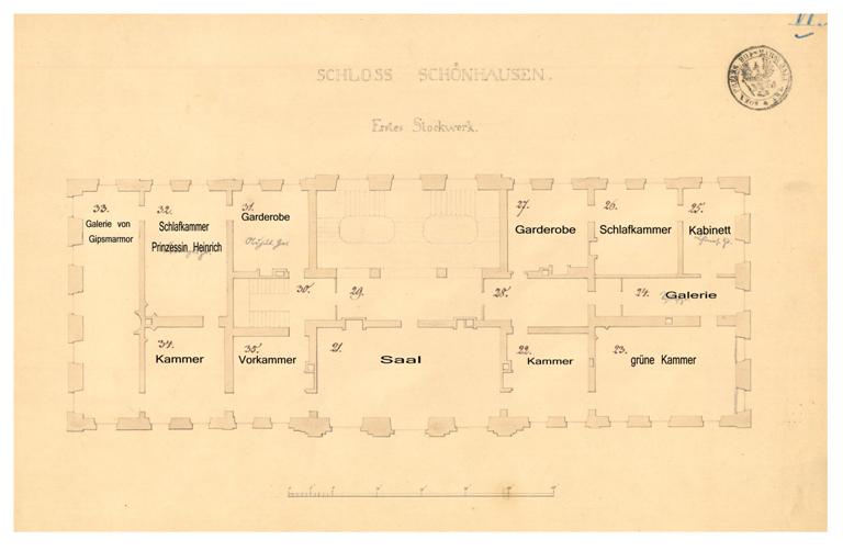 Abb. 2 Grundriss erstes Obergeschoss von circa 1824 mit Funktionen von 1795, Grundriss SPSG, Plansammlung M-Schh., BA 1213, Foto: SPSG, Bearbeitung Windt ©