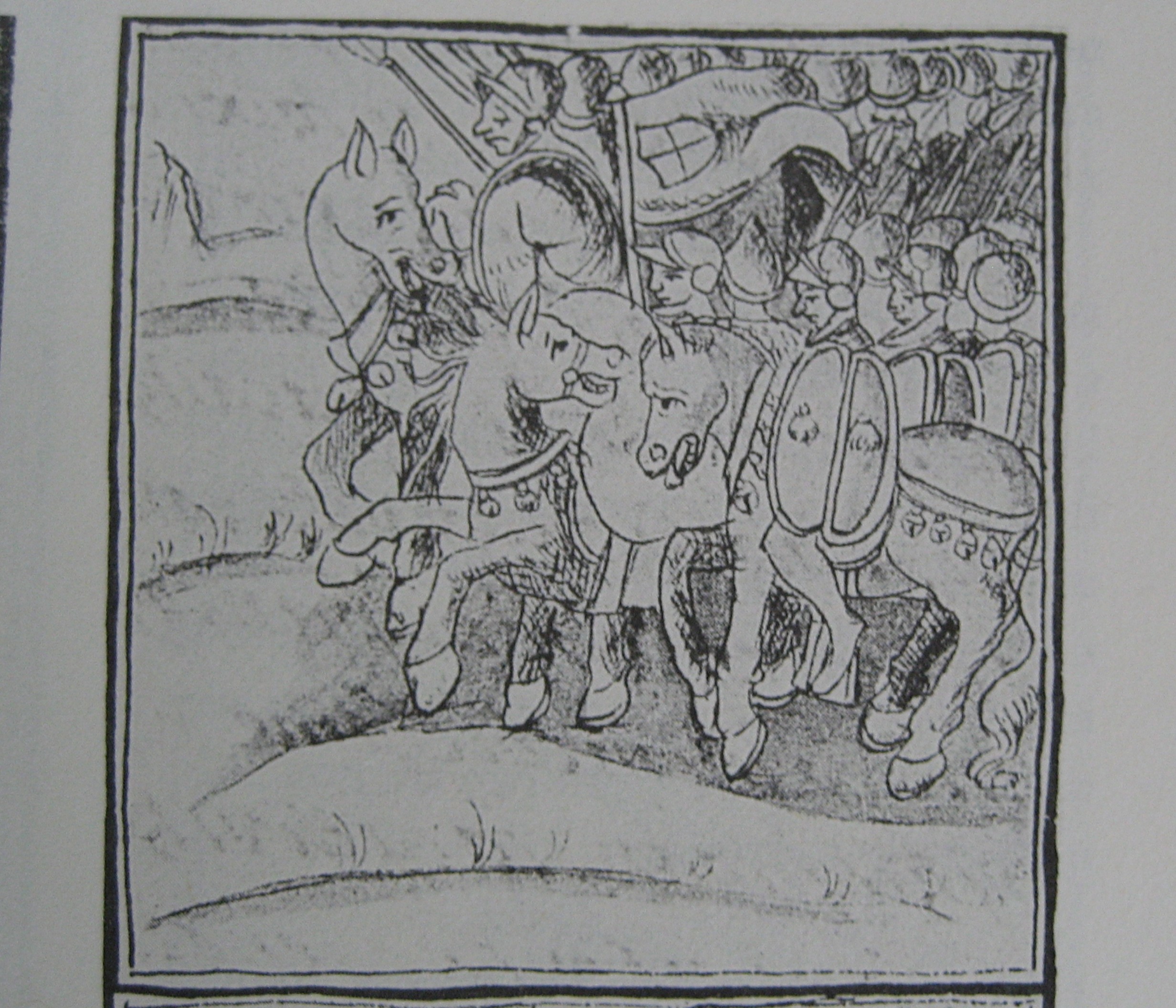 Abb. 3: Die spanischen Conquistadoren reiten nach Tenochtitlan. Florentiner Codex, Buch XII, Folio 22v.