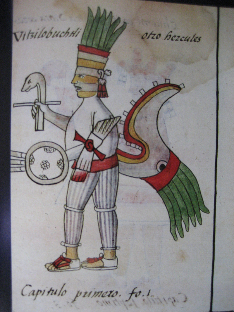 Abb. 6: Florentiner Codex, Buch I, Folio 10r. Das Bild zeigt Huitzilopochtli, den Schutzgott der Mexica, den Gott des Krieges.