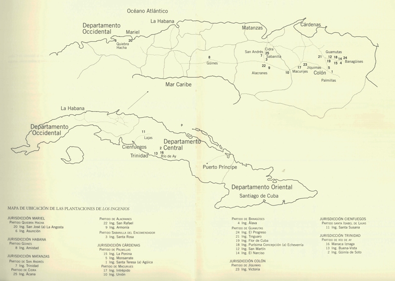 Karte 1 (zwei Teile: 2a Verteilung der dargestellten Ingenios in Westkuba; 2b Verteilung der dargestellten Ingenios im östlichen Westkuba und in Zentralkuba): Justo G.Cantero: Los Ingenios. Colección de vistas de los principales ingenios de azúcar de la isla de Cuba. Dibujos de Eduardo Laplante, La Habana 1857 (moderne Facsimile-Edition: García Mora/ Santamaría García, Antonio (Hg.), Los Ingenios. Colección de vistas de los principales ingenios de azúcar de la Isla de Cuba. El texto redactado por Justo G. Cantero, Con las láminas dibujadas del natural y litografiadas por Eduardo Laplante, Madrid 2005. (Mit freundlicher Genehmigung des Verlages Doce Calles, Aranjuez (Madrid)).
